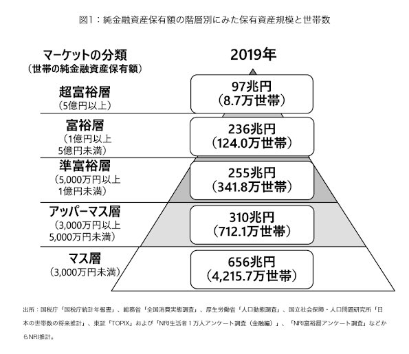 マス層1000万未満、アッパーマス層1000万円〜5000万円未満、準富裕層5000万円〜1億円未満、富裕層1億円〜100億円未満、超富裕層100億円以上