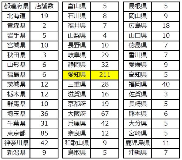 愛知県以外はせいぜい1-2店舗が県内にあるかないかやぞ